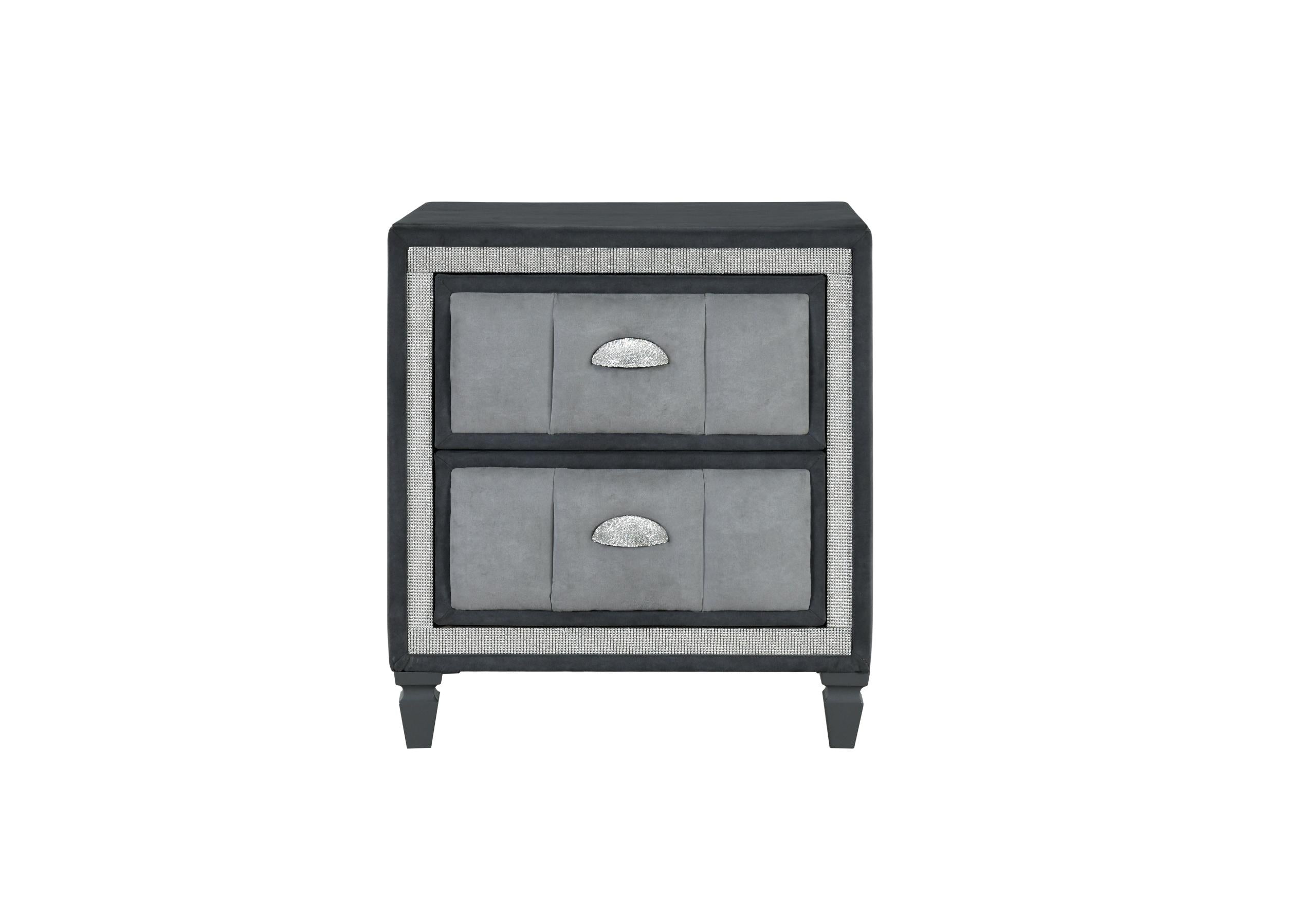 The Vanna Nightstand is a chic and compact storage solution. Fully upholstered in a two-tone grey fabric and accented with crystal glam, this nightstand brings elegance to your bedside. Two drawers with crystal pulls keep your nighttime necessities close at hand.